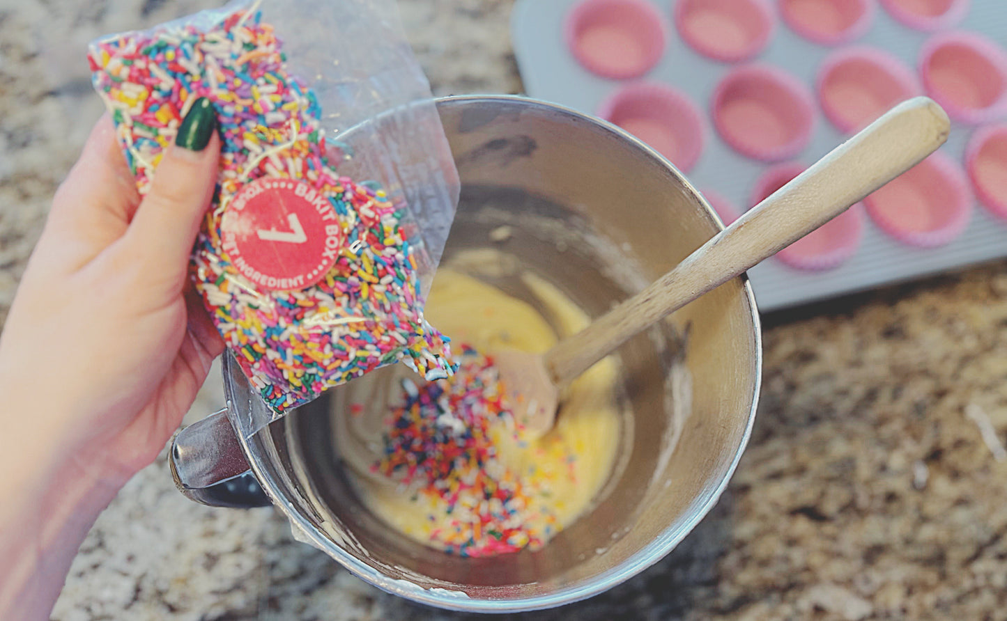 Pre-measured, shelf-stable dry ingredients to bake 12 fluffy confetti cupcakes
