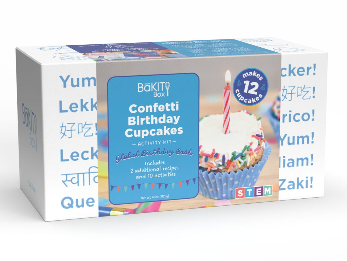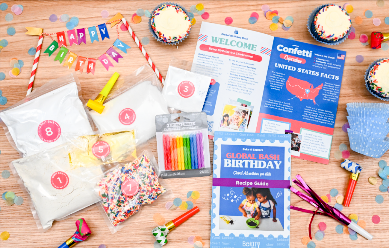 This kit is a birthday celebration in a box. While kids bake, they’ll also: