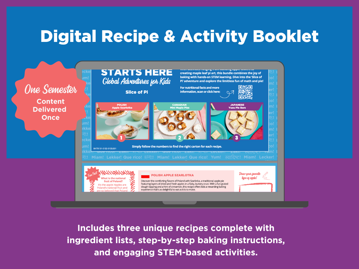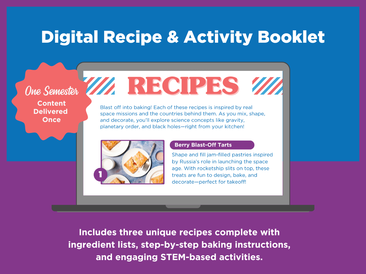 Explore Global Flavors with a STEM Twist: Each quarter, dive into three unique baking activity kits that not only introduce international cuisines but also incorporate STEM principles, allowing your family to taste and learn about the science behind global flavors.